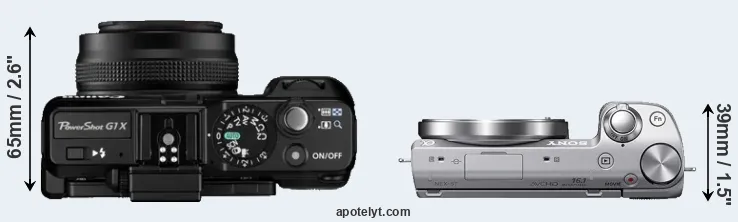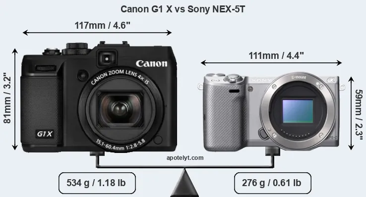 The side-by-side display below illustrates the physical size and weight of the Canon G1 X and the Sony NEX-5T. The two cameras are presented according to their relative size. Three consecutive perspectives from the front, the top, and the back are available. All size dimensions are rounded to the nearest millimeter.