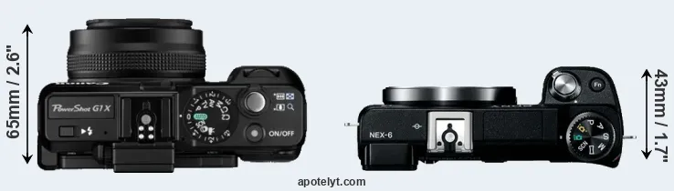 The side-by-side display below illustrates the physical size and weight of the Canon G1 X and the Sony NEX-6. The two cameras are presented according to their relative size. Three consecutive views from the front, the top, and the rear side are shown. All size dimensions are rounded to the nearest millimeter.