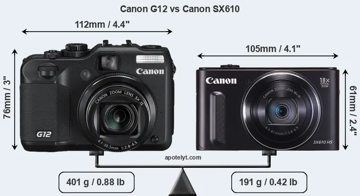 An illustration of the physical size and weight of the Canon G12 and the Canon SX610 is provided in the side-by-side display below. The two cameras are presented according to their relative size. Three consecutive perspectives from the front, the top, and the back are available. All size dimensions are rounded to the nearest millimeter.