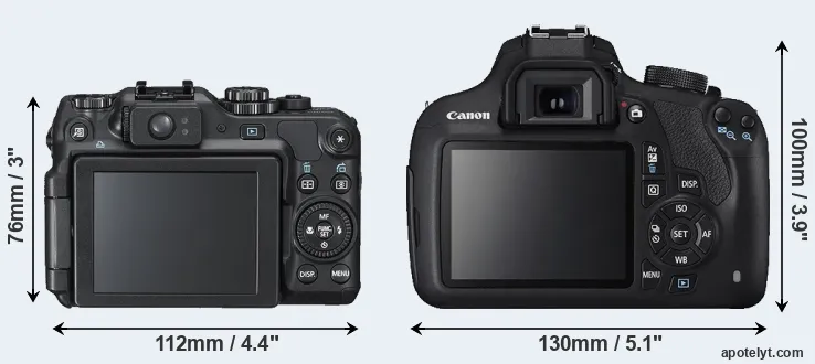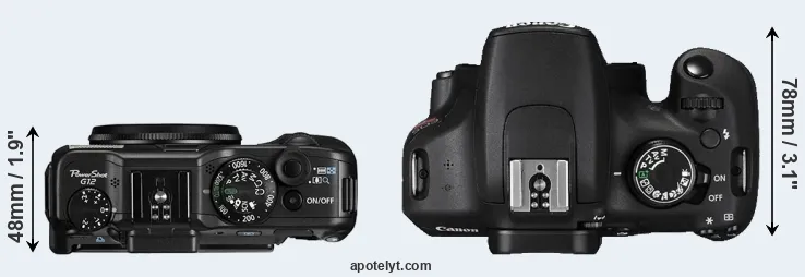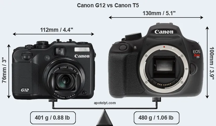 The side-by-side display below illustrates the physical size and weight of the Canon G12 and the Canon T5. The two cameras are presented according to their relative size. Three consecutive views from the front, the top, and the rear side are shown. All width, height and depth dimensions are rounded to the nearest millimeter.
