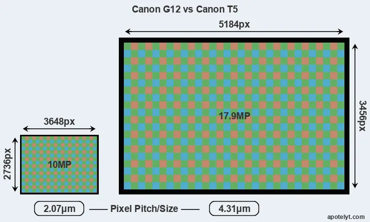 With 17.9MP, the T5 offers a higher resolution than the G12 (10MP), but the T5 nevertheless has larger individual pixels (pixel pitch of 4.31μm versus 2.07μm for the G12) due to its larger sensor. Moreover, the T5 is a much more recent model (by 3 years and 4 months) than the G12, and its sensor will have benefitted from technological advances during this time that further enhance the light gathering capacity of its pixel-units.