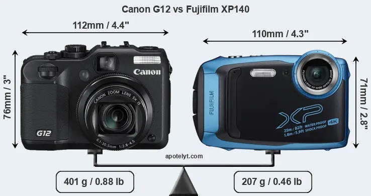 The physical size and weight of the Canon G12 and the Fujifilm XP140 are illustrated in the side-by-side display below. The two cameras are presented according to their relative size. Three successive views from the front, the top, and the rear are shown. All width, height and depth measures are rounded to the nearest millimeter.