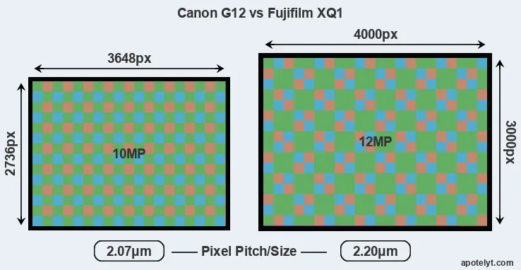 With 12MP, the XQ1 offers a higher resolution than the G12 (10MP), but the XQ1 nevertheless has larger individual pixels (pixel pitch of 2.20μm versus 2.07μm for the G12) due to its larger sensor. Moreover, the XQ1 is a much more recent model (by 3 years and 1 month) than the G12, and its sensor will have benefitted from technological advances during this time that further enhance the light gathering capacity of its pixel-units. Coming back to sensor resolution, it should be mentioned that the XQ1 has no anti-alias filter installed, so that it can capture all the detail its sensor resolves.