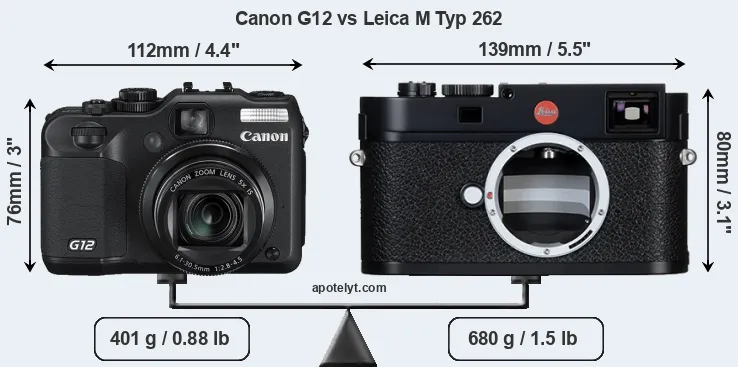 If the front view area (width x height) of the cameras is taken as an aggregate measure of their size, the Leica M Typ 262 is notably larger (31 percent) than the Canon G12. It is noteworthy in this context that the M Typ 262 is splash and dust-proof, while the G12 does not feature any corresponding weather-sealing.