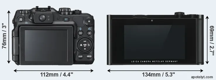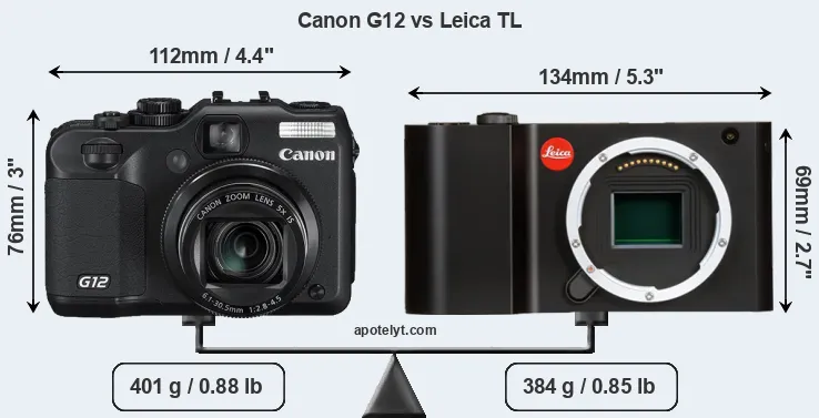 The side-by-side display below illustrates the physical size and weight of the Canon G12 and the Leica TL. The two cameras are presented according to their relative size. Three successive views from the front, the top, and the rear are shown. All width, height and depth dimensions are rounded to the nearest millimeter.