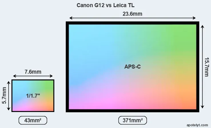 Of the two cameras under consideration, the Canon G12 features a 1/1.7-inch sensor and the Leica TL an APS-C sensor. The sensor area in the TL is 763 percent bigger. As a result of these sensor size differences, the cameras have a format factor of, respectively, 4.6 and 1.5. The sensor in the G12 has a native 4:3 aspect ratio, while the one in the TL offers a 3:2 aspect.