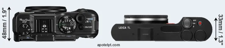 If the front view area (width x height) of the cameras is taken as an aggregate measure of their size, the Leica TL is notably larger (9 percent) than the Canon G12. In this context, it is worth noting that neither the G12 nor the TL are weather-sealed.
