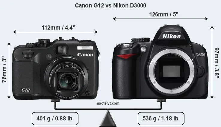 An illustration of the physical size and weight of the Canon G12 and the Nikon D3000 is provided in the side-by-side display below. The two cameras are presented according to their relative size. Three consecutive perspectives from the front, the top, and the back are available. All size dimensions are rounded to the nearest millimeter.