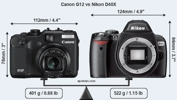 An illustration of the physical size and weight of the Canon G12 and the Nikon D40X is provided in the side-by-side display below. The two cameras are presented according to their relative size. Three consecutive views from the front, the top, and the rear side are shown. All width, height and depth measures are rounded to the nearest millimeter.