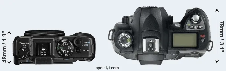 The side-by-side display below illustrates the physical size and weight of the Canon G12 and the Nikon D70. The two cameras are presented according to their relative size. Three successive views from the front, the top, and the rear are shown. All width, height and depth dimensions are rounded to the nearest millimeter.