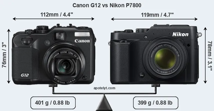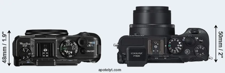 An illustration of the physical size and weight of the Canon G12 and the Nikon P7800 is provided in the side-by-side display below. The two cameras are presented according to their relative size. Three consecutive views from the front, the top, and the rear side are shown. All width, height and depth dimensions are rounded to the nearest millimeter.