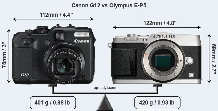 An illustration of the physical size and weight of the Canon G12 and the Olympus E-P5 is provided in the side-by-side display below. The two cameras are presented according to their relative size. Three consecutive views from the front, the top, and the rear side are shown. All size dimensions are rounded to the nearest millimeter.