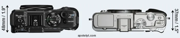 If the front view area (width x height) of the cameras is taken as an aggregate measure of their size, the Olympus E-P5 is somewhat smaller (1 percent) than the Canon G12. In this context, it is worth noting that neither the G12 nor the E-P5 are weather-sealed.