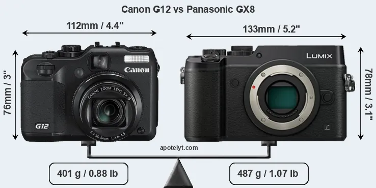 If the front view area (width x height) of the cameras is taken as an aggregate measure of their size, the Panasonic GX8 is notably larger (22 percent) than the Canon G12. It is noteworthy in this context that the GX8 is splash and dust-proof, while the G12 does not feature any corresponding weather-sealing.