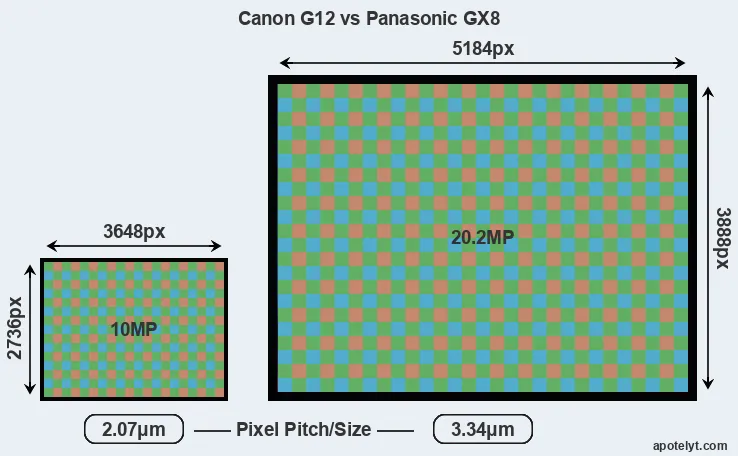 With 20.2MP, the GX8 offers a higher resolution than the G12 (10MP), but the GX8 nevertheless has larger individual pixels (pixel pitch of 3.34μm versus 2.07μm for the G12) due to its larger sensor. Moreover, the GX8 is a much more recent model (by 4 years and 10 months) than the G12, and its sensor will have benefitted from technological advances during this time that further enhance the light gathering capacity of its pixel-units.