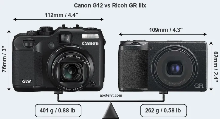 The side-by-side display below illustrates the physical size and weight of the Canon G12 and the Ricoh GR IIIx. The two cameras are presented according to their relative size. Three consecutive perspectives from the front, the top, and the back are available. All width, height and depth dimensions are rounded to the nearest millimeter.