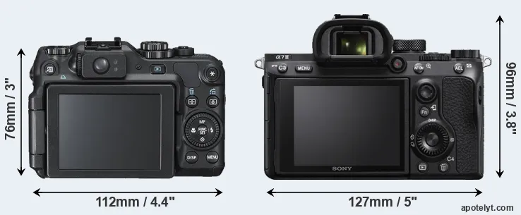 The above size and weight comparisons are to some extent incomplete and possibly misleading, as the G12 has a lens built in, whereas the A7 III is an interchangeable lens camera that requires a separate lens. Attaching the latter will add extra weight and bulk to the setup. You can compare the optics available for the A7 III and their specifications in the Sony FE Lens Catalog.