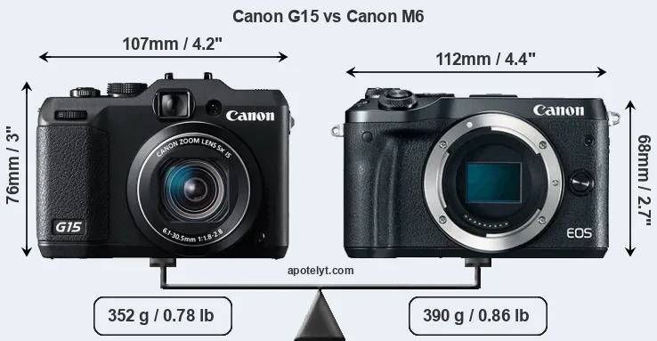 The side-by-side display below illustrates the physical size and weight of the Canon G15 and the Canon M6. The two cameras are presented according to their relative size. Three consecutive views from the front, the top, and the rear side are shown. All width, height and depth dimensions are rounded to the nearest millimeter.