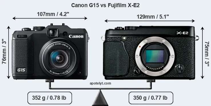 If the front view area (width x height) of the cameras is taken as an aggregate measure of their size, the Fujifilm X-E2 is notably larger (19 percent) than the Canon G15. In this context, it is worth noting that neither the G15 nor the X-E2 are weather-sealed.