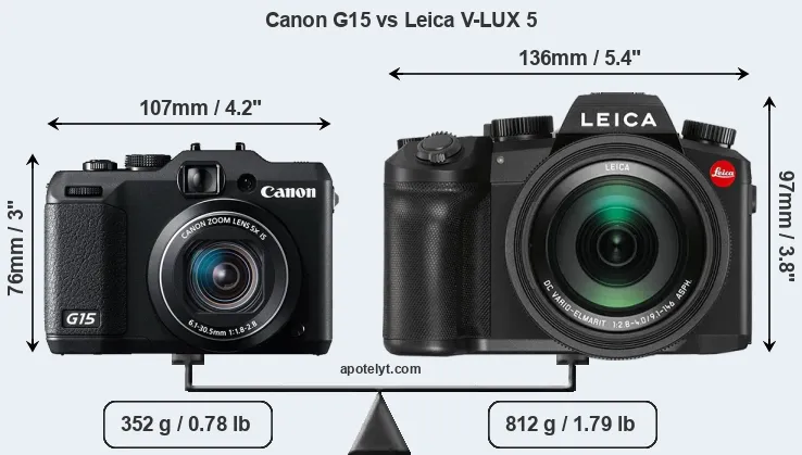 If the front view area (width x height) of the cameras is taken as an aggregate measure of their size, the Leica V-LUX 5 is considerably larger (62 percent) than the Canon G15. Moreover, the V-LUX 5 is substantially heavier (131 percent) than the G15. In this context, it is worth noting that neither the G15 nor the V-LUX 5 are weather-sealed.