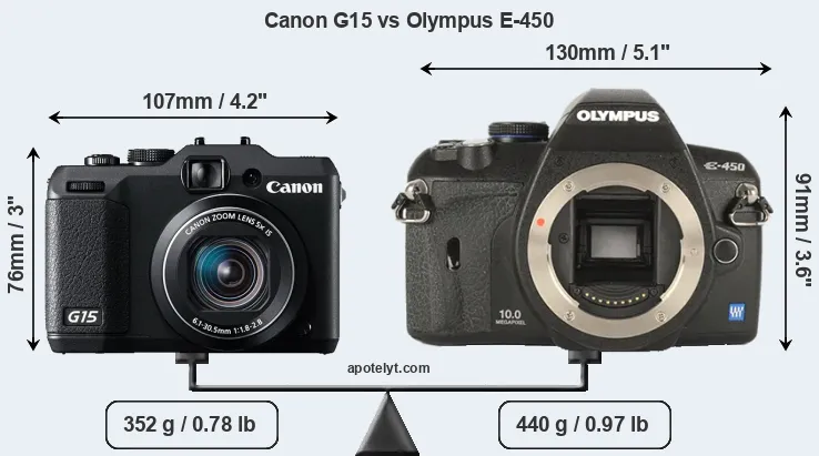 The physical size and weight of the Canon G15 and the Olympus E-450 are illustrated in the side-by-side display below. The two cameras are presented according to their relative size. Three consecutive perspectives from the front, the top, and the back are available. All width, height and depth dimensions are rounded to the nearest millimeter.
