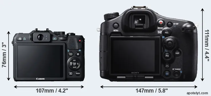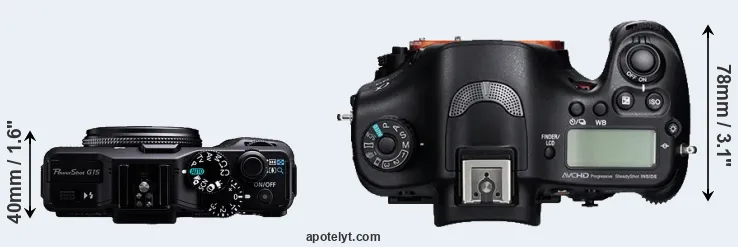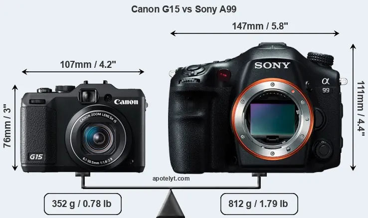 The physical size and weight of the Canon G15 and the Sony A99 are illustrated in the side-by-side display below. The two cameras are presented according to their relative size. Three consecutive perspectives from the front, the top, and the back are available. All width, height and depth dimensions are rounded to the nearest millimeter.