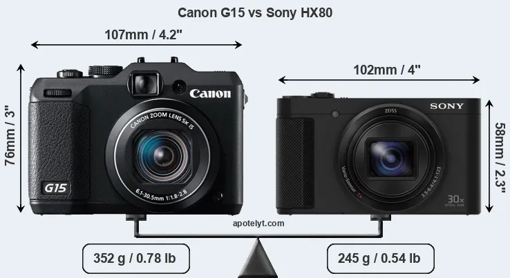 An illustration of the physical size and weight of the Canon G15 and the Sony HX80 is provided in the side-by-side display below. The two cameras are presented according to their relative size. Three successive views from the front, the top, and the rear are shown. All width, height and depth dimensions are rounded to the nearest millimeter.