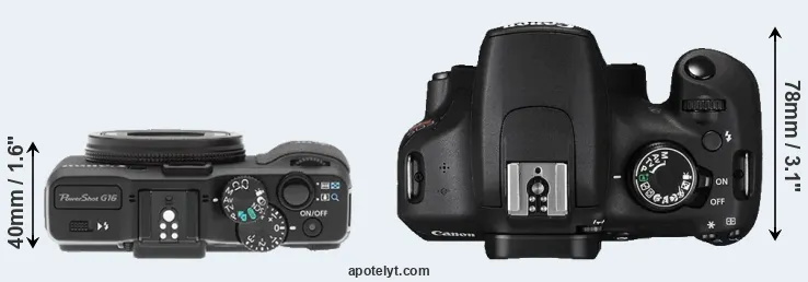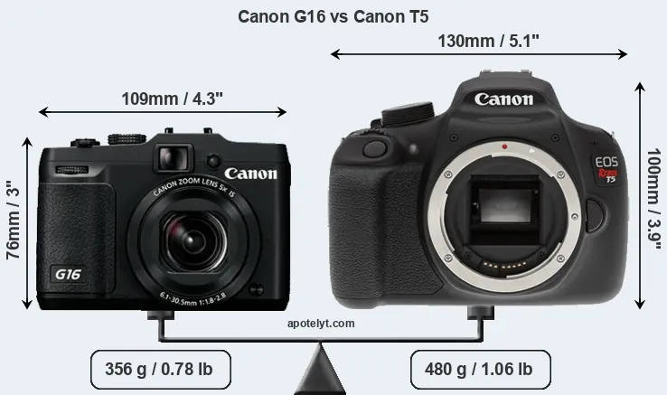 An illustration of the physical size and weight of the Canon G16 and the Canon T5 is provided in the side-by-side display below. The two cameras are presented according to their relative size. Three consecutive perspectives from the front, the top, and the back are available. All width, height and depth dimensions are rounded to the nearest millimeter.