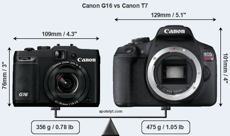 An illustration of the physical size and weight of the Canon G16 and the Canon T7 is provided in the side-by-side display below. The two cameras are presented according to their relative size. Three consecutive views from the front, the top, and the rear side are shown. All width, height and depth measures are rounded to the nearest millimeter.