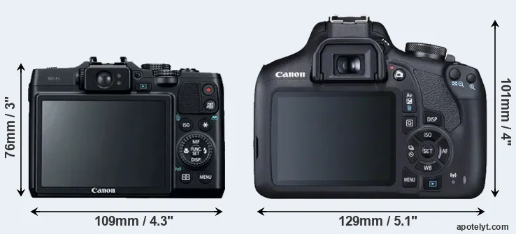 The above size and weight comparisons are to some extent incomplete and possibly misleading, as the G16 has a lens built in, whereas the T7 is an interchangeable lens camera that requires a separate lens. Attaching the latter will add extra weight and bulk to the setup. You can compare the optics available for the T7 and their specifications in the Canon EF Lens Catalog.