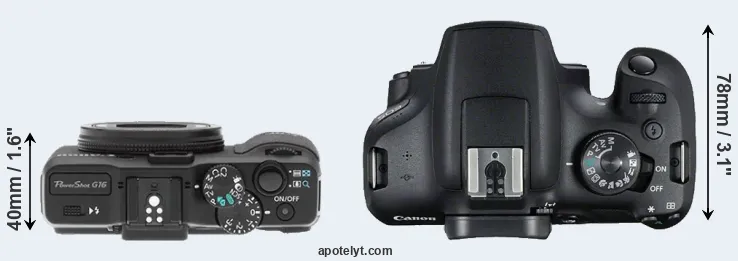 The Canon PowerShot G16 and the Canon EOS Rebel T7 (labelled Canon 2000D in some countries) are two digital cameras that were officially introduced, respectively, in August 2013 and February 2018. The G16 is a fixed lens compact, while the T7 is a DSLR. The cameras are based on a 1/1.7-inch (G16) and an APS-C (T7) sensor. The G16 has a resolution of 12 megapixels, whereas the T7 provides 24 MP.
