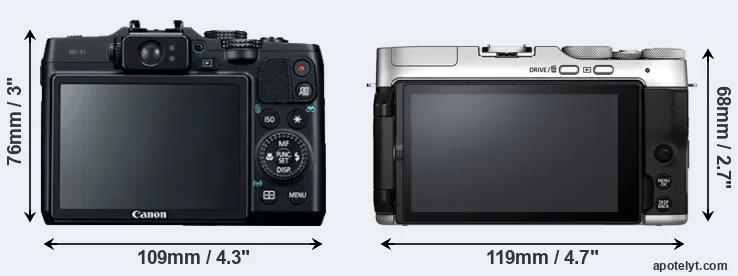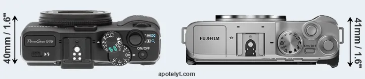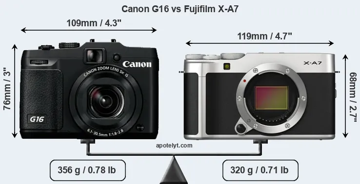 The side-by-side display below illustrates the physical size and weight of the Canon G16 and the Fujifilm X-A7. The two cameras are presented according to their relative size. Three consecutive perspectives from the front, the top, and the back are available. All width, height and depth dimensions are rounded to the nearest millimeter.