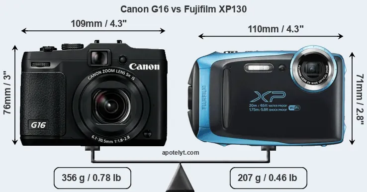 An illustration of the physical size and weight of the Canon G16 and the Fujifilm XP130 is provided in the side-by-side display below. The two cameras are presented according to their relative size. Three consecutive views from the front, the top, and the rear side are shown. All width, height and depth measures are rounded to the nearest millimeter.