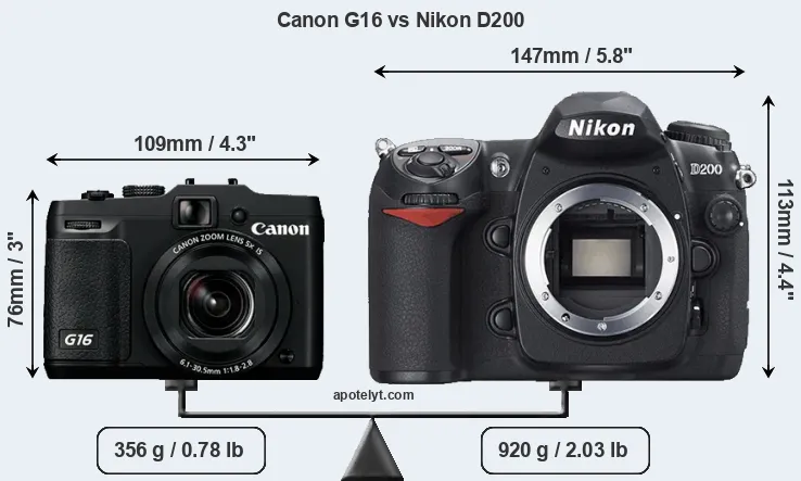 The side-by-side display below illustrates the physical size and weight of the Canon G16 and the Nikon D200. The two cameras are presented according to their relative size. Three successive views from the front, the top, and the rear are shown. All width, height and depth measures are rounded to the nearest millimeter.
