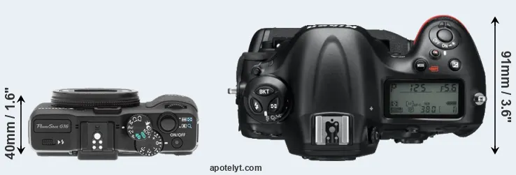 An illustration of the physical size and weight of the Canon G16 and the Nikon D4 is provided in the side-by-side display below. The two cameras are presented according to their relative size. Three successive views from the front, the top, and the rear are shown. All size dimensions are rounded to the nearest millimeter.