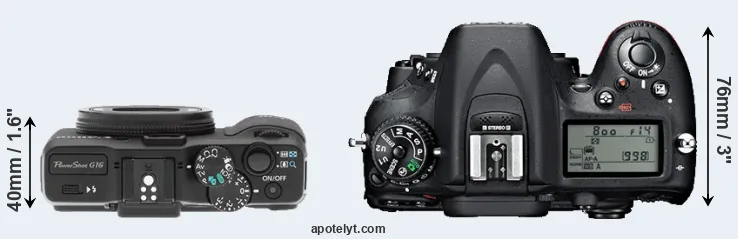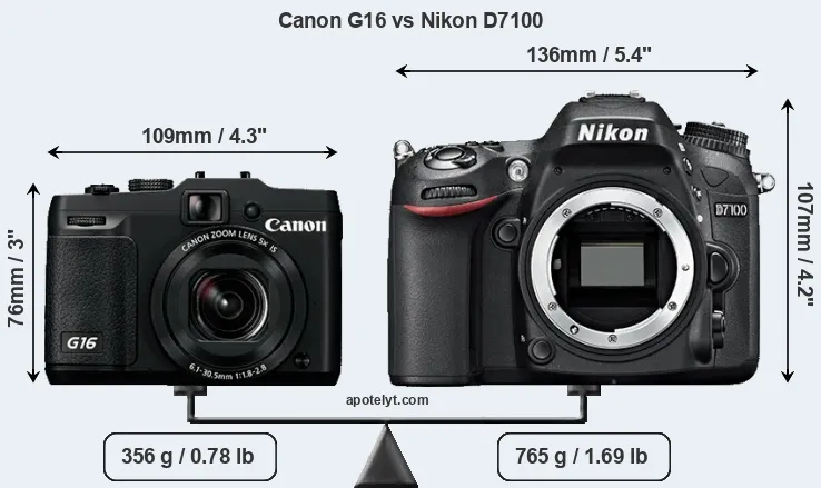 The physical size and weight of the Canon G16 and the Nikon D7100 are illustrated in the side-by-side display below. The two cameras are presented according to their relative size. Three consecutive perspectives from the front, the top, and the back are available. All width, height and depth dimensions are rounded to the nearest millimeter.