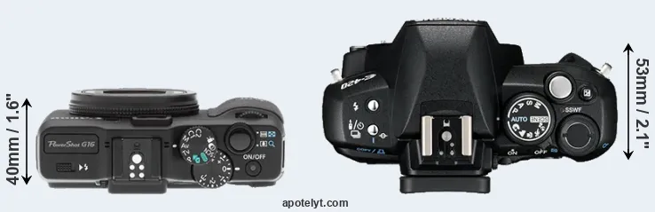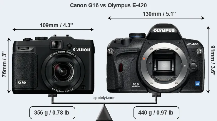The side-by-side display below illustrates the physical size and weight of the Canon G16 and the Olympus E-420. The two cameras are presented according to their relative size. Three consecutive perspectives from the front, the top, and the back are available. All width, height and depth measures are rounded to the nearest millimeter.