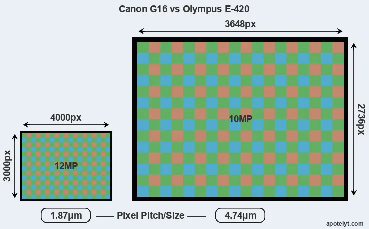 Despite having a smaller sensor, the Canon G16 offers a higher resolution of 12 megapixels, compared with 10 MP of the Olympus E-420. This megapixels advantage comes at the cost of a higher pixel density and a smaller size of the individual pixel (with a pixel pitch of 1.87μm versus 4.74μm for the E-420). However, it should be noted that the G16 is much more recent (by 5 years and 5 months) than the E-420, and its sensor will have benefitted from technological advances during this time that make it possible to gather light more efficiently.