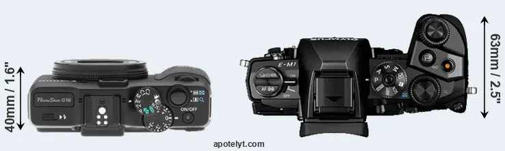 If the front view area (width x height) of the cameras is taken as an aggregate measure of their size, the Olympus E-M1 is considerably larger (48 percent) than the Canon G16. It is noteworthy in this context that the E-M1 is splash and dust-proof, while the G16 does not feature any corresponding weather-sealing.