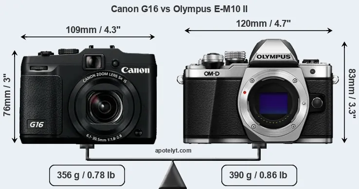 An illustration of the physical size and weight of the Canon G16 and the Olympus E-M10 II is provided in the side-by-side display below. The two cameras are presented according to their relative size. Three successive views from the front, the top, and the rear are shown. All width, height and depth measures are rounded to the nearest millimeter.