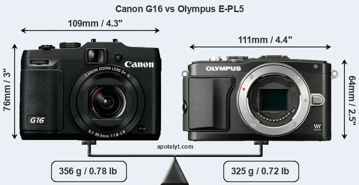 An illustration of the physical size and weight of the Canon G16 and the Olympus E-PL5 is provided in the side-by-side display below. The two cameras are presented according to their relative size. Three successive views from the front, the top, and the rear are shown. All width, height and depth measures are rounded to the nearest millimeter.