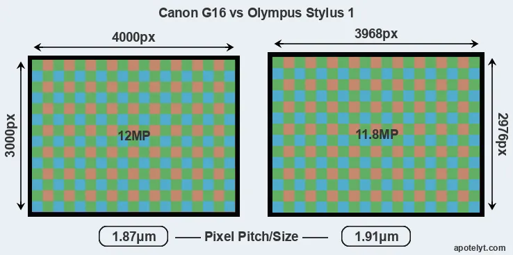 Despite having a slightly smaller sensor, the Canon G16 offers a higher resolution of 12 megapixels, compared with 11.8 MP of the Olympus Stylus 1. This megapixels advantage comes at the cost of a higher pixel density and a smaller size of the individual pixel (with a pixel pitch of 1.87μm versus 1.91μm for the Stylus 1). It is noteworthy in this context that the two cameras were released in close succession, so that their sensors are from the same technological generation. Coming back to sensor resolution, it should be mentioned that the Stylus 1 has no anti-alias filter installed, so that it can capture all the detail its sensor resolves.