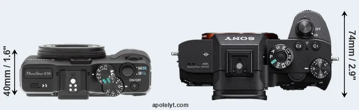 An illustration of the physical size and weight of the Canon G16 and the Sony A7R III is provided in the side-by-side display below. The two cameras are presented according to their relative size. Three successive views from the front, the top, and the rear are shown. All width, height and depth measures are rounded to the nearest millimeter.