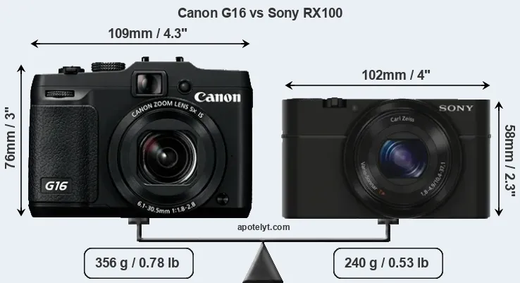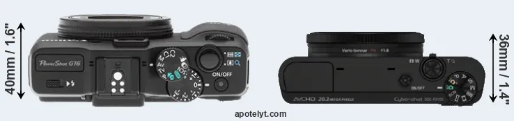 The side-by-side display below illustrates the physical size and weight of the Canon G16 and the Sony RX100. The two cameras are presented according to their relative size. Three consecutive perspectives from the front, the top, and the back are available. All width, height and depth dimensions are rounded to the nearest millimeter.