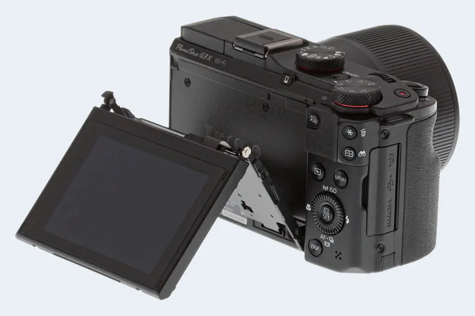 The LCD screen on the Canon PowerShot G3 X is flexibly attached to the body. In particular, the LCD can be tilted vertically to facilitate odd-angle shots in landscape orientation. This tilting design is often preferred, for example, by street photographers to a fully articulated, swivel type of LCD attachment, as it is more unobtrusive during shooting than a screen that flips out to the side.