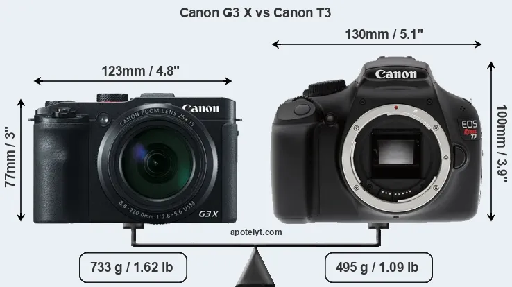 The physical size and weight of the Canon G3 X and the Canon T3 are illustrated in the side-by-side display below. The two cameras are presented according to their relative size. Three successive views from the front, the top, and the rear are shown. All width, height and depth measures are rounded to the nearest millimeter.