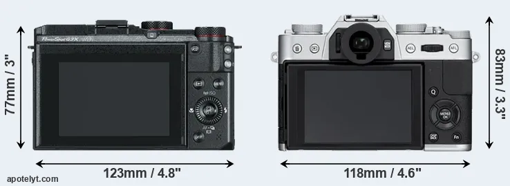 If the front view area (width x height) of the cameras is taken as an aggregate measure of their size, the Fujifilm X-T10 is somewhat larger (3 percent) than the Canon G3 X. It is worth mentioning in this context that the G3X is splash and dust resistant, while the X-T10 does not feature any corresponding weather-sealing.