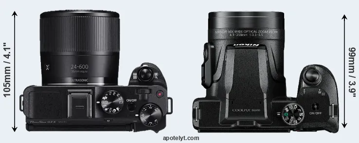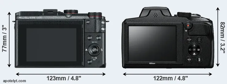 The physical size and weight of the Canon G3 X and the Nikon B600 are illustrated in the side-by-side display below. The two cameras are presented according to their relative size. Three consecutive perspectives from the front, the top, and the back are available. All width, height and depth measures are rounded to the nearest millimeter.