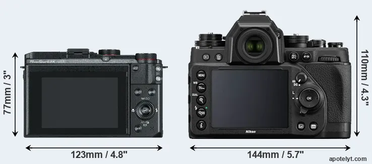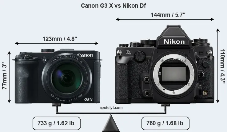 If the front view area (width x height) of the cameras is taken as an aggregate measure of their size, the Nikon Df is considerably larger (67 percent) than the Canon G3 X. In this context, it is worth noting that both cameras are splash and dust-proof and can, hence, be used in inclement weather conditions or harsh environments.