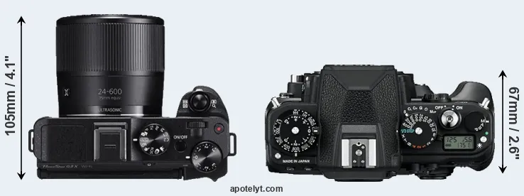 The above size and weight comparisons are to some extent incomplete and possibly misleading, as the G3X has a lens built in, whereas the Df is an interchangeable lens camera that requires a separate lens. Attaching the latter will add extra weight and bulk to the setup. You can compare the optics available for the Df and their specifications in the Nikon Lens Catalog.